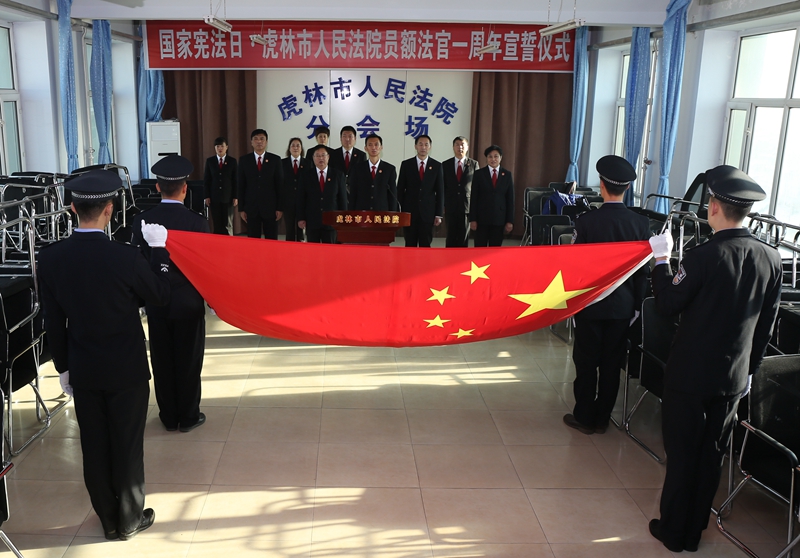 “12.4”国家宪法日暨全国法制宣传日,虎林法院党组高度重视,为加强宣传力度,提前安排部署宣传方案,12月4日上午,虎林法院组织党组成员、员额法官在六楼会议室通过视频直播方式,参加最高人民法院开展宪法宣誓活动。