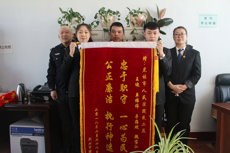 2018年3月5日上午,当事人刘某来到虎林法院,亲手为民二庭王迪法官的审判团队送上一面“忠于职守、一心为民,公正廉洁、执行神速”的锦旗,以此表达他的感激之情。