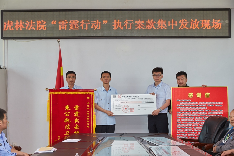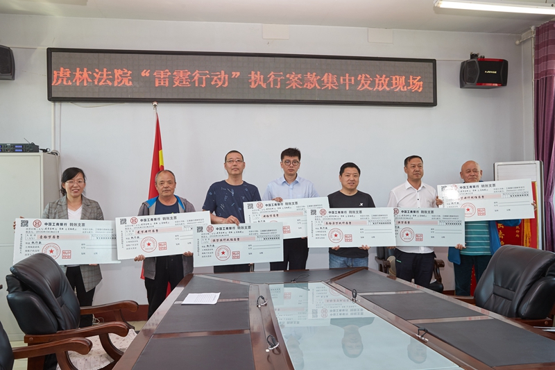 连续8天,192小时,拘传65人,司法拘留59人,罚款141.2万元,执结案件85件,促使被执行人主动履行债务总额61万元,实际执行到位标的额1002.5万元,虎林法院“基本解决执行难”雷霆行动集中打击周取得阶段性成果。6月12日,虎林法院举行执行案款集中发放日活动,为7件执行案件的申请人兑现执行案款104万元,最大一笔执行案款高达40万元,虎林法院用实实在在的“真金白银”兑付给申请人,以丰硕的司法战果践行司法为民。