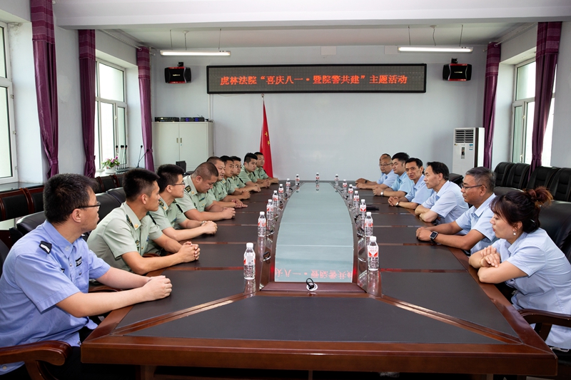 为庆祝中国人民解放军建军91周年,进一步加强与部队官兵的联系和交流。8月1日,应虎林法院邀请,虎林市边防武警官兵10余人在中队长王猛的带领下参加了法院“喜庆八一·暨院警共建”第十七次公众开放日活动,并举行座谈会,就武警官兵关心的涉法问题进行深入交流。院党组书记、院长沙云凯,党组副书记、常务副院长褚廷友,办公室主任任伟伟及各业务庭代表参加了座谈会。