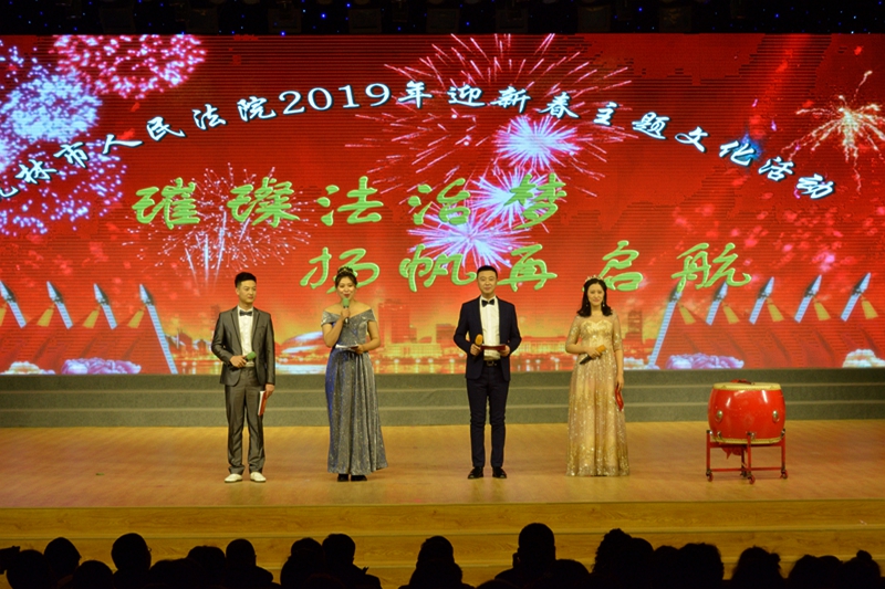 党组书记、院长沙云凯为联欢会致辞,对辛勤工作一年的干警们,向默默奉献、无私支持的干警家属,向关心法院振兴发展的离退休老同志,致以亲切的慰问,并送上新年的祝福。他指出,虎林法院亮点多多,成绩斐然。这一年,收结案均创历史新高,收案达到历史峰值5301件,年末众志成城,结案率刷新了六年记录接近94%;员额法官人均结案292件,位居全省175个基层法院第二名,刚刚收到省院石时态院长发来贺信;决战“执行难”、“扫黑除恶”、诉调对接、多元化解、扶贫攻坚、整顿作风、党建廉政、法院文化、法宣调研等多项工作,多次得到上级肯定和表扬;“省级文明单位、全省办案标兵、国际雪雕比赛、最具影响抖音、百优庭审文书”我们登榜夺魁,全年3个集体、15名干警分别获得国家、省市级荣誉。展望2019,虎林法院站在一个新的历史起点。党组决定,新的一年,我们将紧紧围绕“司法为民、公正司法”目标任务,全力抓好“司法改革、队伍建设”两个关键,用实际行动为“生态强市、美丽虎林”做贡献。我坚信,2019,必将是千帆竞发的一年、硕果累累的一年;2019,我愿和我的战友们,用青春汗水,圆璀璨法治梦,让巨轮再启航!