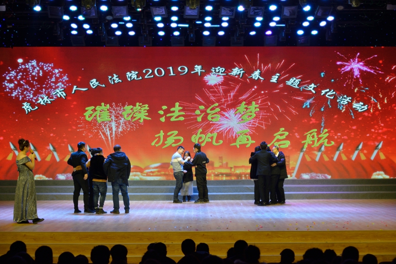 联欢会在舞蹈《欢聚一堂》中拉开序幕。随后,干警们精心准备的三句半《法院那点事儿》、歌曲独唱《新贵妃醉酒》、舞蹈《琵琶行》、现场作画《大话西游》等15个精彩纷呈的节目相继登场。舞台剧《两代法官的心灵对话》引起大家的共鸣,获得观众热烈的掌声; 舞蹈《光与影》玩转光与影的魅力,领略黑与白的碰撞; 个个精彩纷呈的节目在展现法院干警风采、彰显法治力量的同时,不断把晚会推向了高潮。整个表演包括了歌曲、舞蹈、小品、乐器演奏等多种艺术形式,干警们精彩投入的舞台表演,赢得现场阵阵热烈的掌声和欢呼声。最后在院党组、执行局的大合唱《公正执法》、《众人划桨开大船》中,本次“璀璨法治梦,扬帆再起航”迎新春主题文化活动圆满落下帷幕。