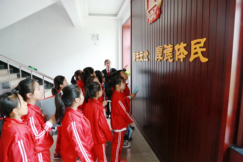 在法治文化浮雕前,讲解员用浅显易懂的语言给小学生们介绍了法治文化浮雕刻画出的法治元素和它们的背景意义,小学生们专心致志地聆听,对法院的各项工作和文化建设充满了好奇。