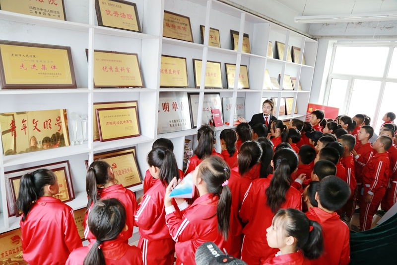 在讲解员的引导下,小学生们先后参观了诉讼服务中心、科技法庭、多元化解办公室、法治文化浮雕、司法警察大队、执行指挥中心、荣誉室等场所,在参观过程中,讲解员向小学生们详细介绍了法官的主要职责和各场所的功能和特点,让小学生们对法院和法官的工作有了初步认识。