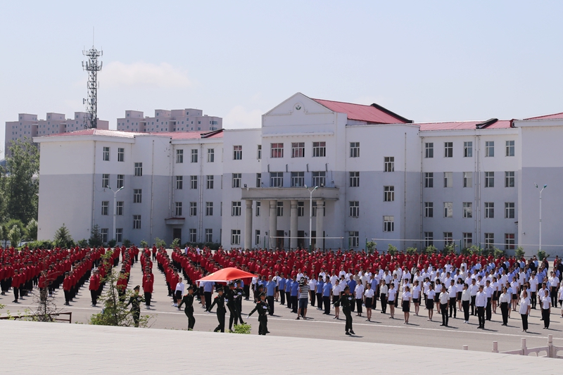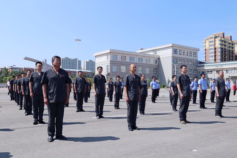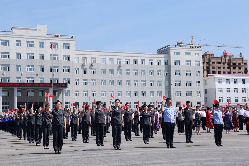 为隆重庆祝新中国成立70周年,深入贯彻落实习近平新时代中国特色社会主义思想和党的十九大精神,按照中共虎林市委宣传部要求,2019年7月10日,虎林法院40名干警组成方队参加“共和国长子的家国情怀”万人升国旗、唱国歌、佩戴国旗徽章活动。
