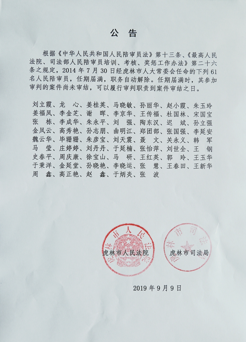 虎林市人民法院关于公布任期届满人民陪审员名单公告