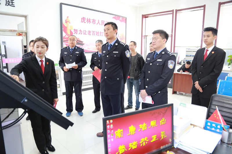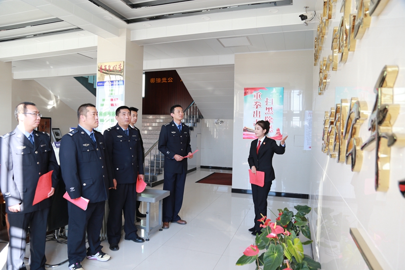 庭审观摩过后,派出所民警在讲解员的引导下来到诉讼服务中心、科技法庭、执行指挥中心、法院文化长廊和荣誉室等场所。在诉讼服务中心,讲解员细致的讲解了立案工作流程以及各项便民利民服务措施,让派出所民警感受到虎林法院为践行“四零”服务和“打官司不求人”的庄严承诺所做的努力。