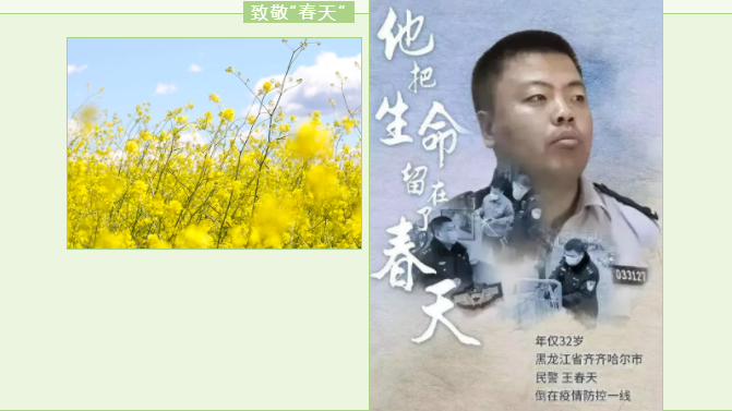静夜,我拨通了齐齐哈尔市同学的电话,知道了“春天”更多的感人故事,同时也知道了公安战线又有干警因公殉职;今晨,网上又知晓黄文军等4位抗疫一线医生离开了我们,最小的年仅29岁……他们,是“苟利国家生死以,岂因祸福避趋之”的最真实写照;他们,正如“春天”,就是我们打赢这场总体战、阻击战的春天啊!