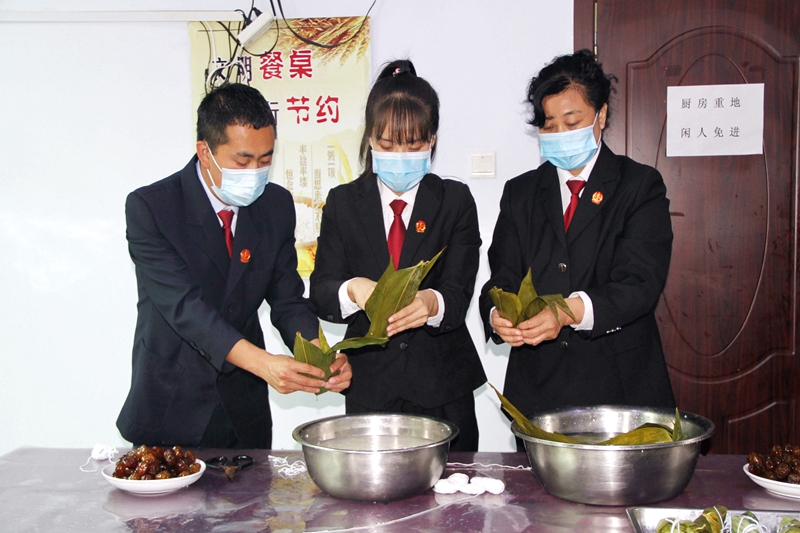 虎林法院法官、干警提前准备了泡好的糯米、蜜枣、粽叶等食材,大家一起卷粽叶、装糯米、裹粽子……动作一气呵成,一个个粽子在灵巧的手中飞快地包好,不一会儿,三角形、长条形等各种各样的粽子就成型了。