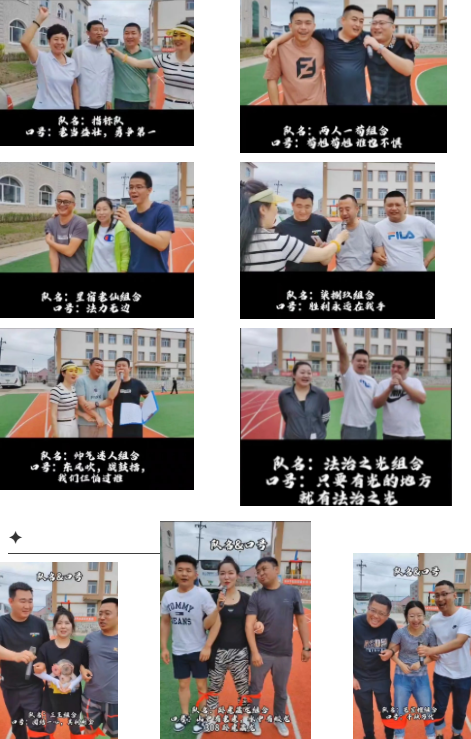 在接下来的活动中,全体执行干警同唱国歌,随后组织开展了趣味竞赛,设置了“执行在路上”“直奔指标”“快立快执”等多个结合执行工作命名的趣味竞赛项目。干警们卸下平时工作的压力,组成九个小队进行比赛,每个小队都有自己的名字和独特口号,如“指标队”的口号为“指标指标我爱你,就像老鼠爱大米”和“老当益壮,永争第一”。干警们个个精神抖擞,奋勇争先,整个比赛过程精彩纷呈、妙趣横生,不乏激烈的角逐,但更多的是此起彼伏的欢笑声和加油声。大家在活动中增进着友谊,也在欢笑中凝聚着合力。