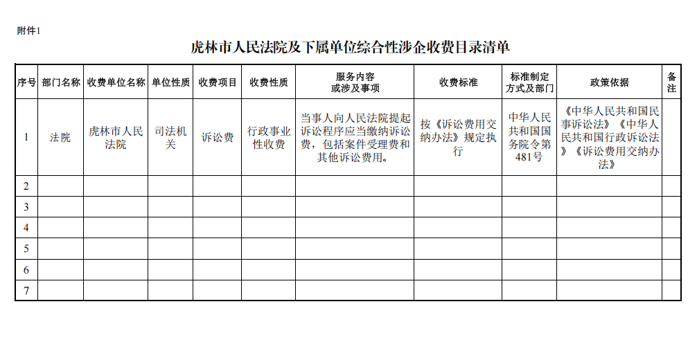 虎林市人民法院及下属单位综合性涉企收费目录清单