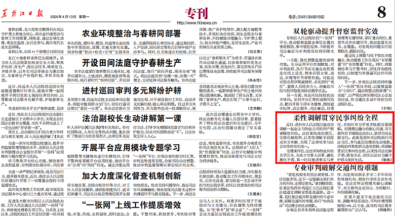 《黑龙江日报》2026年4月13日第8版刊发了虎林市人民法院题为《柔性调解贯穿民事纠纷全程》的文章。