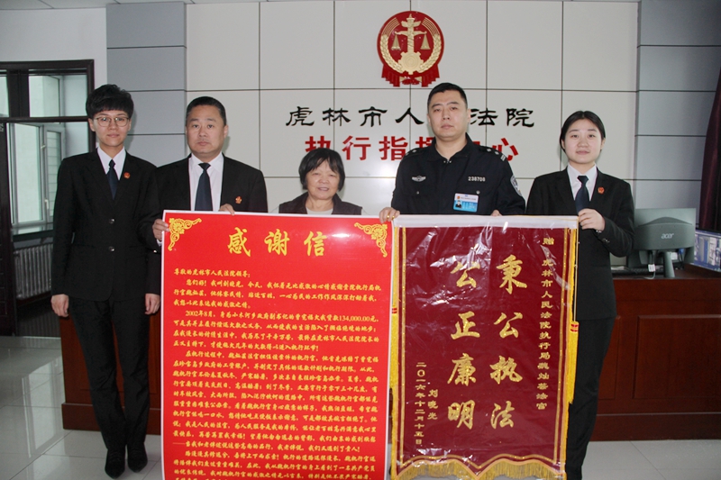 踏着明媚的晨光,迈着轻快的步子,76岁的刘大娘拿着鲜艳的锦旗与感谢信走进虎林法院,笑容满面地对值班法警说,“您好,我叫刘晓光,我想找执行局局长和执行法官魏灿芸,我是来为他们送感谢信和锦旗的!”