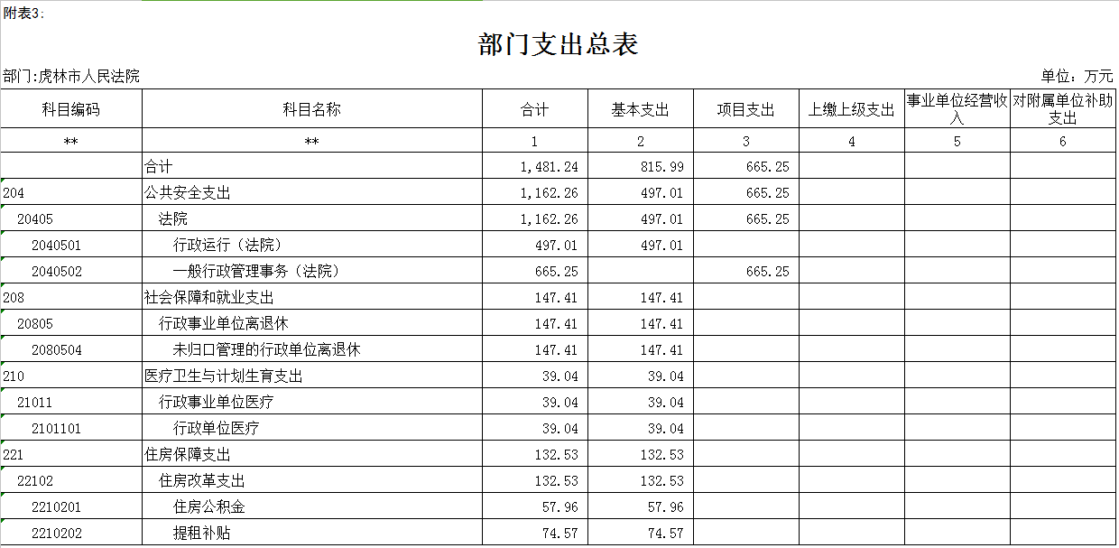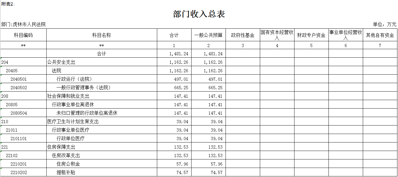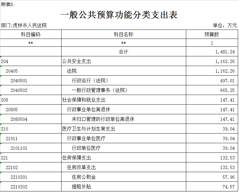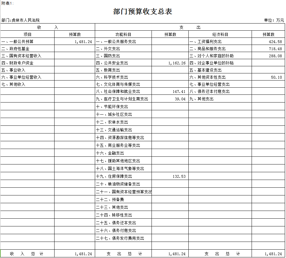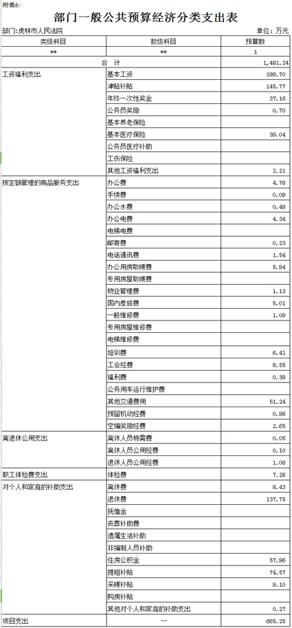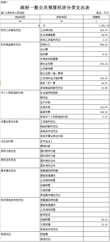 一、关于公共预算收支总表说明虎林市人民法院2017年收支总预算1481.24万元,财政拨款收入1481.24万元。其中:工资福利支出424.58万元,对个人和家庭补助支出288.08万元,商品和服务支出718.48万元,其他资本性支出50.1万元