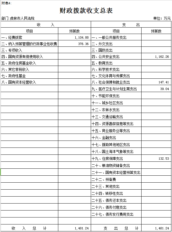 虎林市人民法院2017年财政拨款预算数1481.24万元,具体安排情况如下: