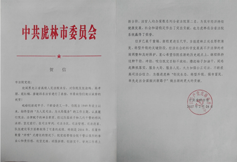 日前,虎林市委向法院发来贺信,祝贺虎林法院2016年法官人均结案214件,取得全省法院第二名并被省法院通报表扬的优异成绩。