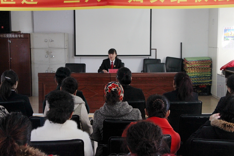 讲座由民一庭审判员张淑梅法官主讲,她结合自身审判工作经验,运用法律理论与实际案例相结合的方式,针对妇女维权的薄弱环节和法律盲区,深入浅出地为妇女同胞做了一场案例贴近生活、发人深思的法制讲座,赢得了阵阵掌声。讲座结束后,青年干警向妇女同胞发放了《中华人民共和国反家庭暴力法》、《妇女权益保障法》、《婚姻法》等普法宣传资料,张淑梅法官还与社区的妇女同胞进行了交流座谈,认真解答了妇女同胞提出的关于婚姻家庭生活中经常遇到的赡养继承、婚姻财产纠纷、子女抚养、家庭暴力等问题,引导广大妇女同胞学会用法律武器来保护自己的合法权益。